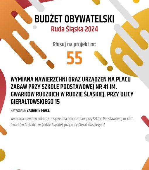 Szanowni Państwo! Pojawiła się szansa na pozytywną zmianę! Prosimy o wsparcie modernizacji placu zabaw przy naszej szkole! Wystarczy oddać głos oraz przekazać informację dalej:) Głosować można on – line kilkając w link https://rudaslaska.budzet-obywatelski.org/glosowanie lub osobiście ( najbliższy punkt znajduje się w Miejskiej Bibliotece Publicznej Filia nr 16). Wybieramy projekt 55!